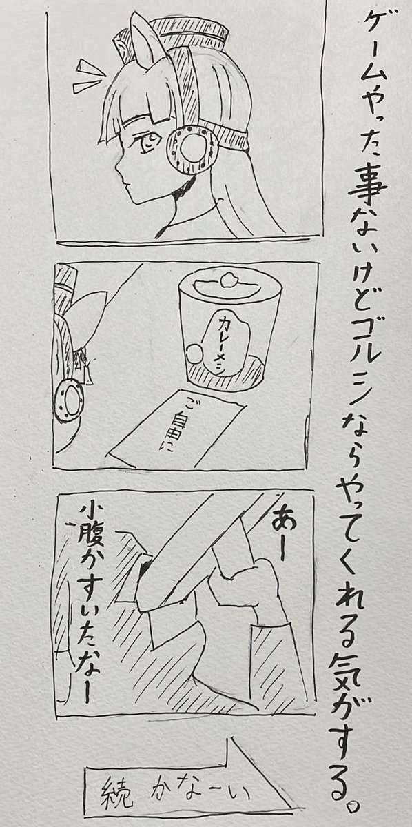 ゴルシならこのネタをやってくれるかもと思って書いた3コマ #ウマ娘 #イラスト #アナログ #絵描きさんと繫がりたい #絵描きさんとつながりたい #イラスト好きな人と繋がりたい #イラスト好きさんと繋がりたい #ゴールドシップ #カレーメシ