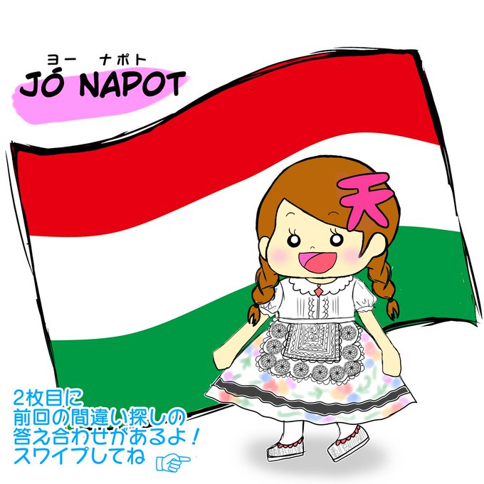 白い布にカラフルな花のカロチャ刺繍が きれいなハンガリーの衣装を着ています😄 ①紅葉 ②葉っぱ ③木の大きさ ④頭の角度 ⑤ソールの色 みんなは全部分かったかな? #海外旅行 #ハンガリー #カロチャ刺繍 #イラスト #イラスト好きな人と繋がりたい #絵描きさんと繋がりたい #ゆるいイラスト
