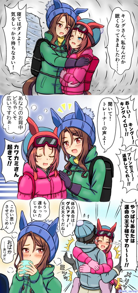雪山で遭難する二人。アカウントを凍結された時のアイコンが彼女たちだったことから見た幻覚。 実際に凍結解除されたのはそれから12日後のことでした。#ウマ娘 #キングヘイロー #カワカミプリンセス
