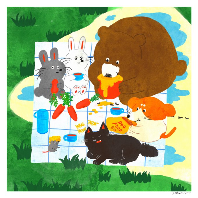 これはWeb個展用(onl.la/qu4Fuyx)に描き下ろしたイラストです! 動物たちのピクニック🐻🐰🐱🐶🐭 #イラスト #illustration #オリジナルイラスト #procreate #ピクニック #カワチ画材