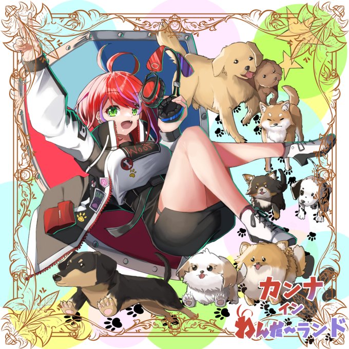【おしごと】茜音カンナ様のお誕生日記念SDグッズのイラストを担当させていただきました!たくさんわんわんを描いてほしい!と頂きましたので、わんわん王国にさせていただきました🐶🐶🐶お誕生日おめでとうございます!🐿⚔️🐶❤️ #カンナ誕生2023