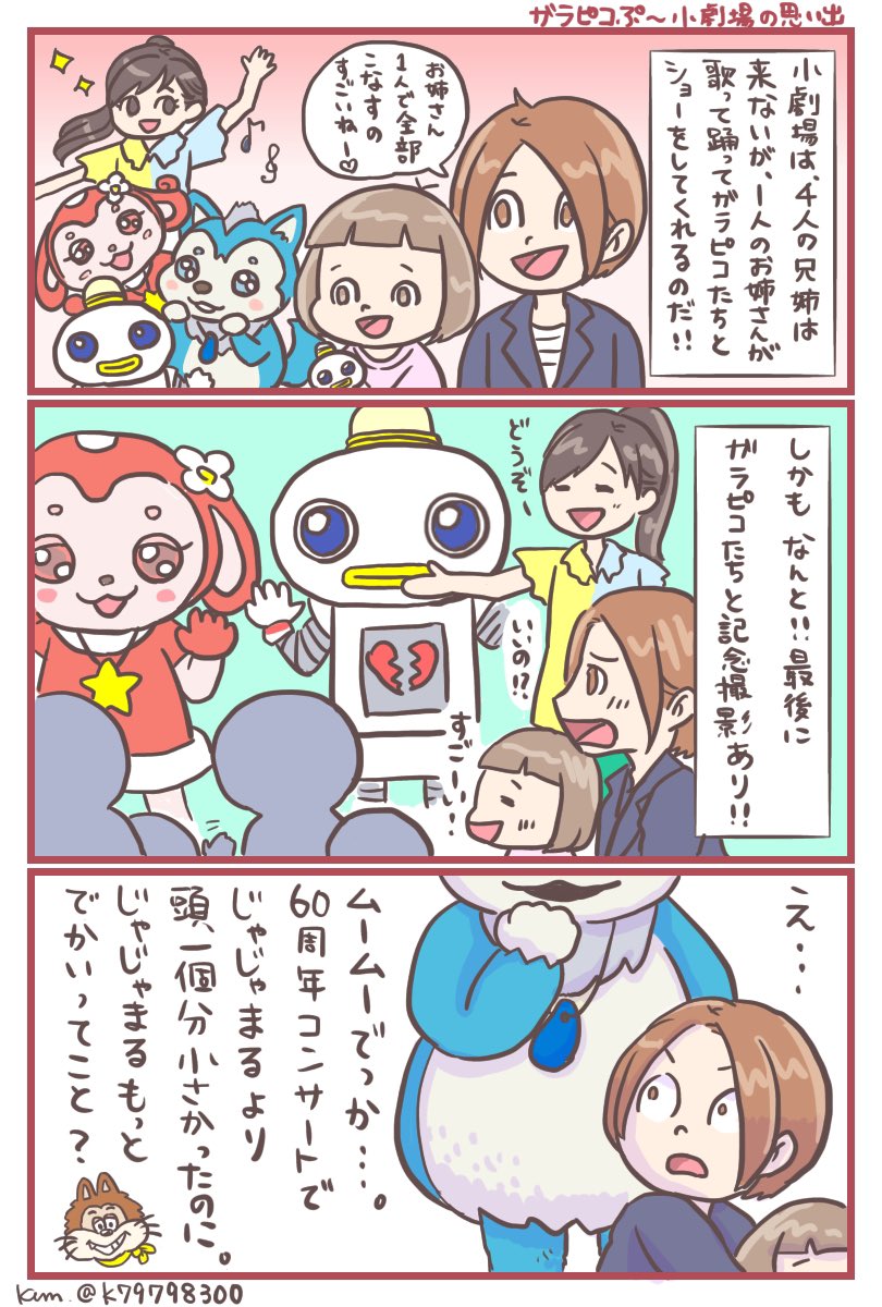 小出し④ これはガラピコたちとの思い出。 こちらも奇跡的に近場に来たので、最初で最後の小劇場でした!! 近くで観たムームーたちは大きかった。🤗🐺🤖🐰 #おかあさんといっしょ #ガラピコぷー #育児漫画