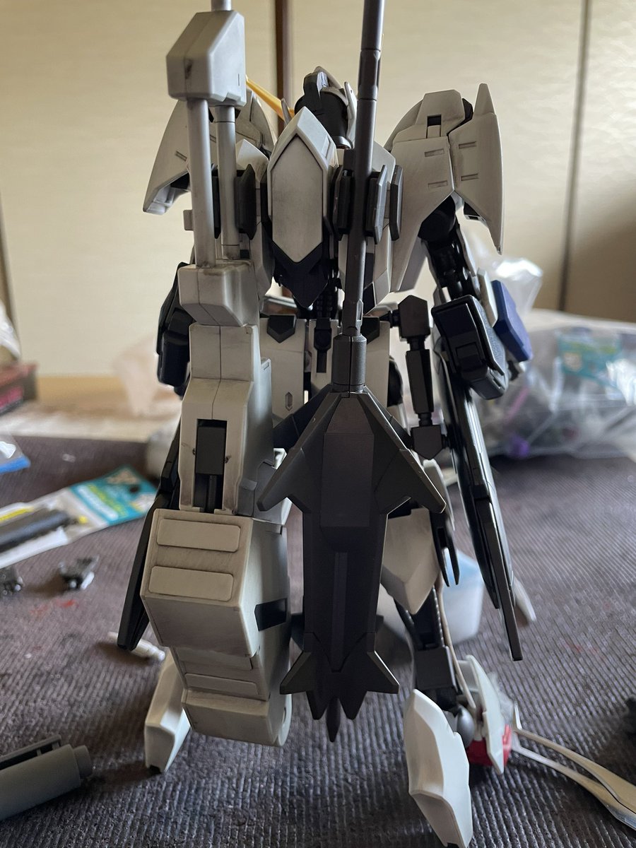 部分塗装を完了😊 大きな失敗なくできました✌️ 軍艦色2と白のカラーリングが🎨 思った以上に良い🌟気がします🤩 太刀のマスキングを剥がすのは🗡 めっちゃ気持ちよかったです😆 いいペースで追い上げれてます😊👍 #ガンプラ #ガンプラの画像貼るとRTされると聞いて #ガンダムバルバトス