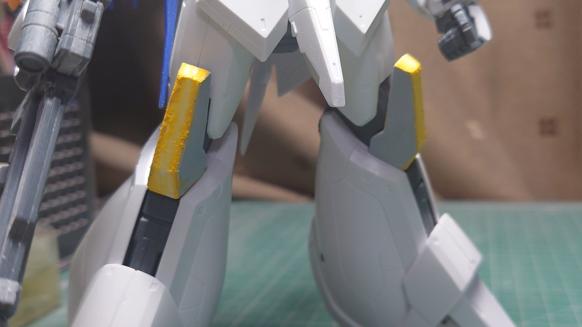 今日は、膝アーマーに0.5㎜プラ板を両サイドに貼って1㎜幅増し。 パテ盛って1晩乾燥させます。 #ガンダムリントヴルム #ガンプラの画像貼るとRTされると聞いて #ガンプラはどんな発想で作ってもいいんだ