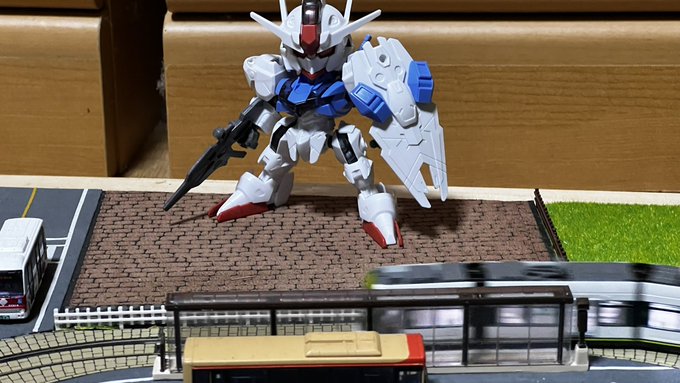 SDエアリアルくんの素組みが出来たので自作鉄道模型レイアウトの立像になってもらいました✨🛤🚃✨ #エアリアル #水星の魔女 #ガンダム・エアリアル #ガンプラ #ガンプラの画像を貼るとRTされると聞いて
