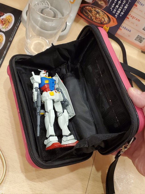 #ガンプラとお出かけ 第三話 『ガンダム、運ぶ命令』 ドンキで入手した スーツケース型ポーチ ↓ モバイル+スーツケース ↓ モビルスーツ+ケース ↓ モビルスーツケース✨イエーイ✌️ あ、シャア色ですサーセン🙇♀️ #ガンプラ