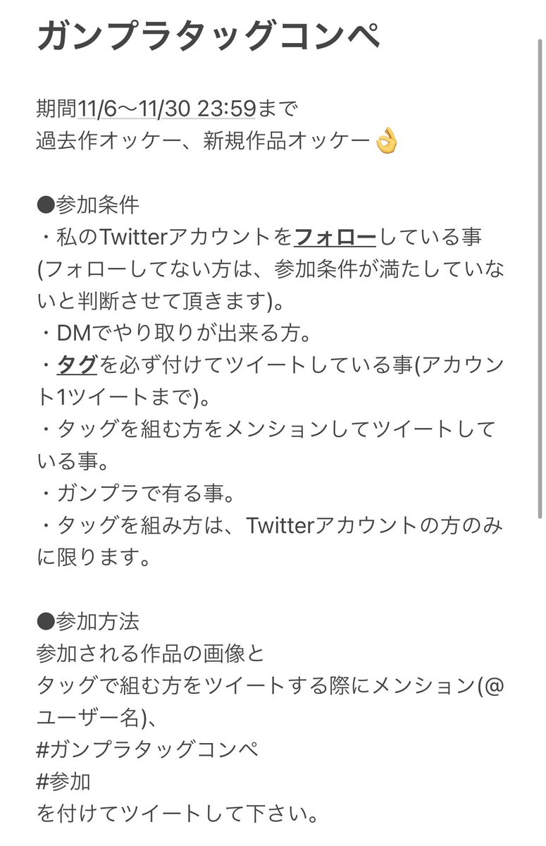 🔥新企画始動🔥 ガンプラタッグコンペ開催🕺🏿 期間11/6〜11/30 23:59 仲が良いTwitterアカウントのフォロワーさんと一緒に参加して下さい😉 詳しい詳細は画像を参考に❗️ ご質問などはコメント頂ければと思います! #ガンプラタッグコンペ #ガンプラ #ガンプラ好きと繋がりたい