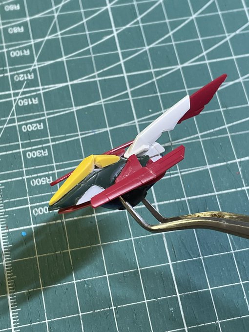 マークレゾン 頭部が大まかに完成しました やすったりサフ吹いたりはまだですがこのバラバラカラーの時も結構好きです 最近はできたパーツごとに塗装してましたが久しぶりに完成まで置いておこうかな #ガンプラファフナー化