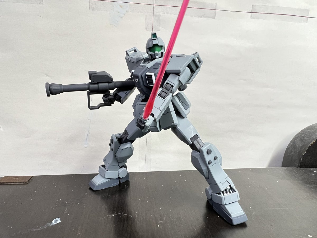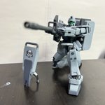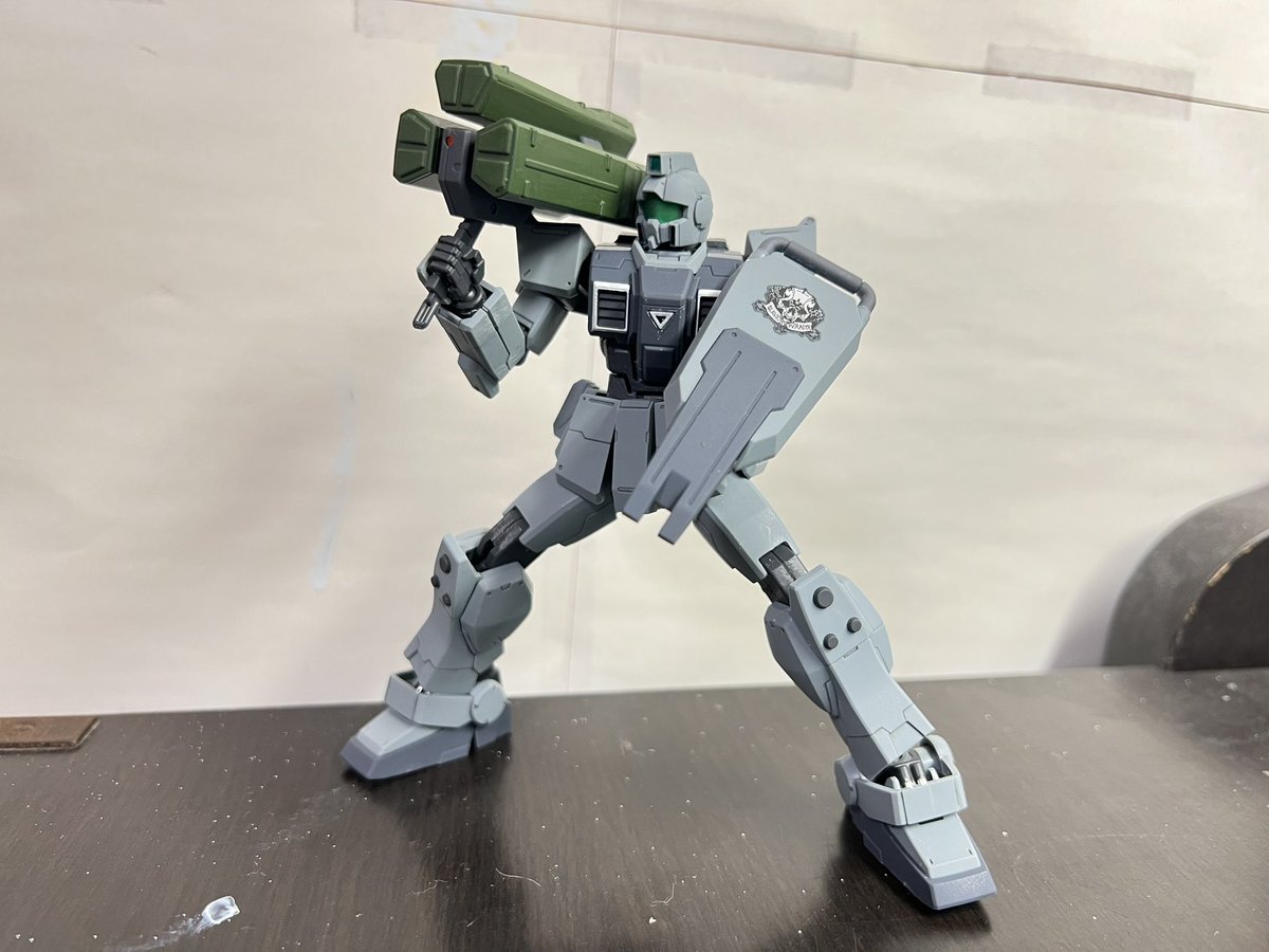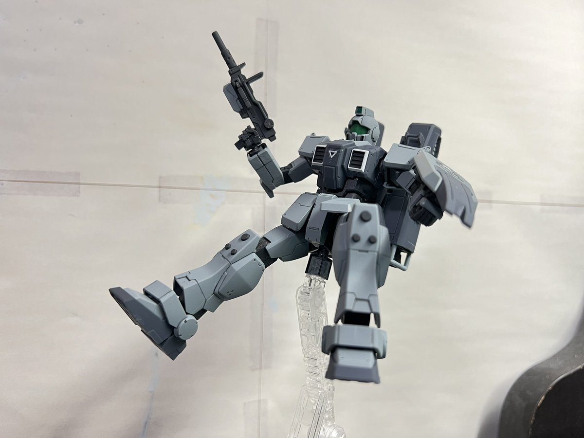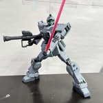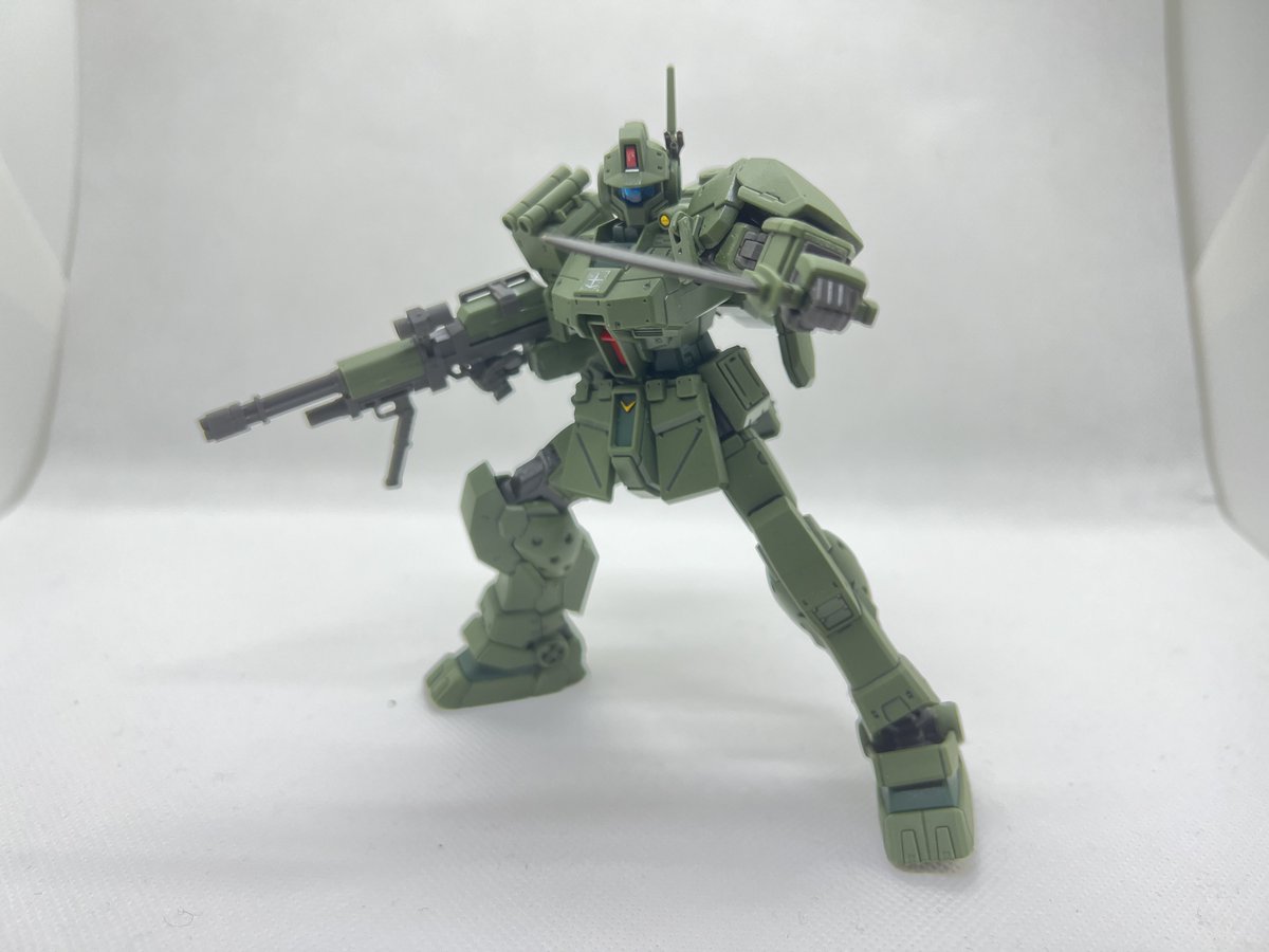 #ガンプラプチレビュー HGUC 陸戦型ジム(スレイヴ・レイス隊仕様)(パラシュート・パック仕様) 完成です✨ 可動域は広いです❗️色分けはセンサー、グレー、ダークグレー、ダークグリーン、黒、白、赤が足りないです。パラシュートパック以外にもコンテナや武装がいくつか付属します❗️頭部も新規の物に‼️