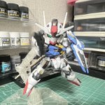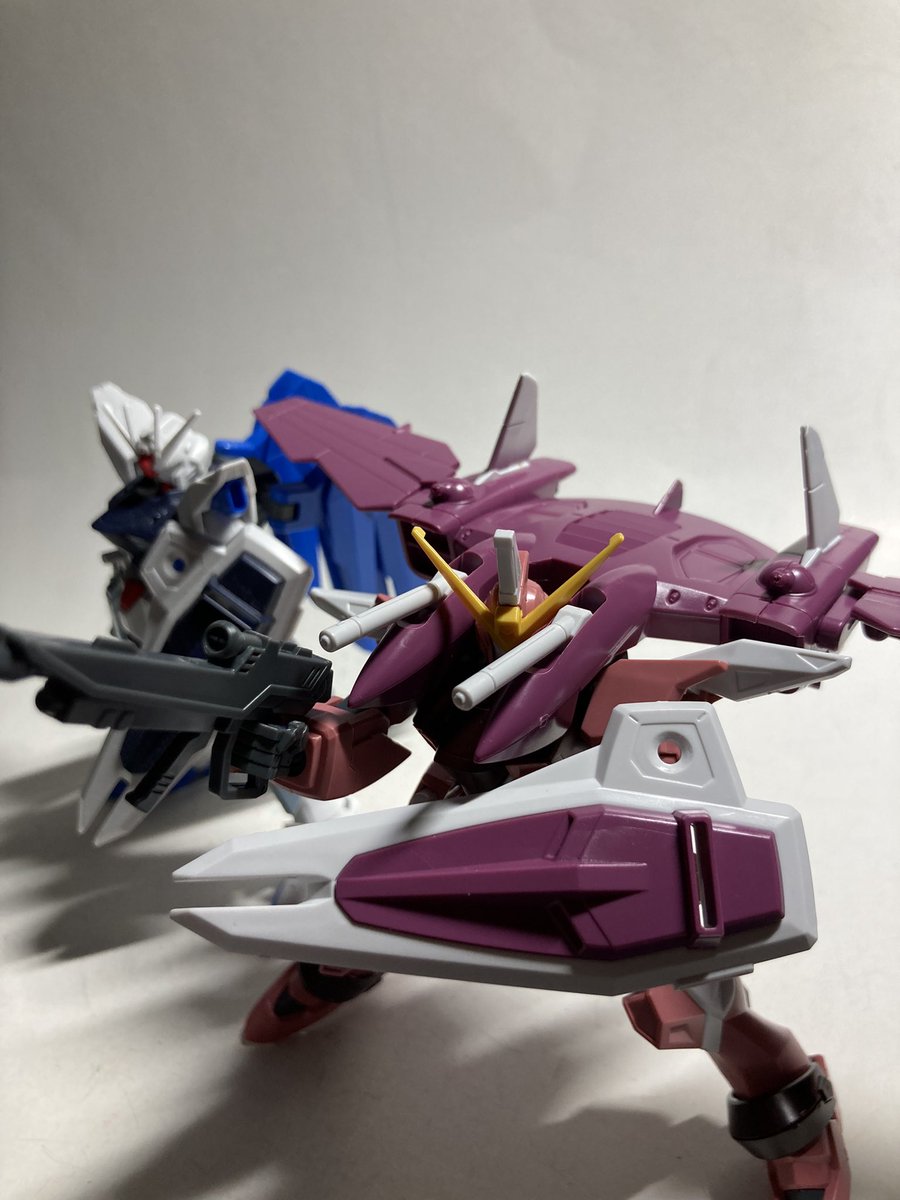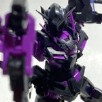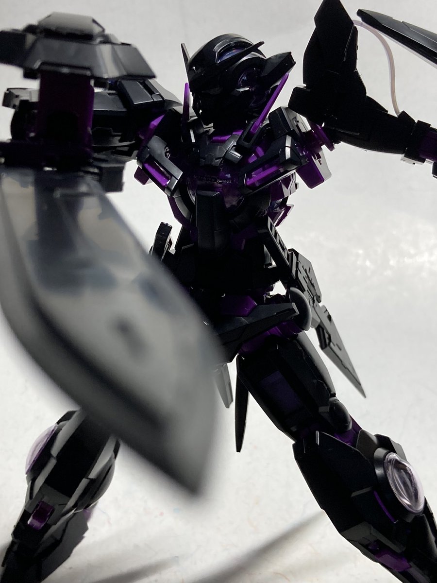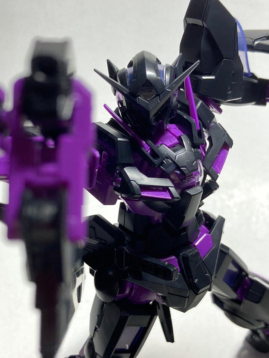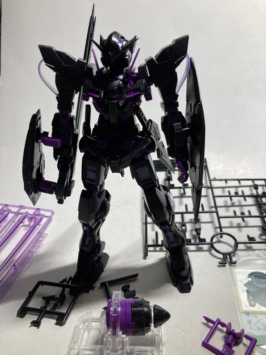 ガンダムエクシアネオンパープルカラー完成 素組みだけでもかっこいいエクシア 黒い部分のパーツは全てエコプラ使用となっていて紫の関節類はブラックライトで光る仕様となっています1部にはオリジナルデカールも付属しています 雰囲気的にGNドライブなしの撮影 #ガンプラ #ガンプラプチレビュー