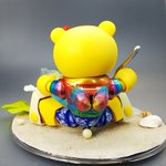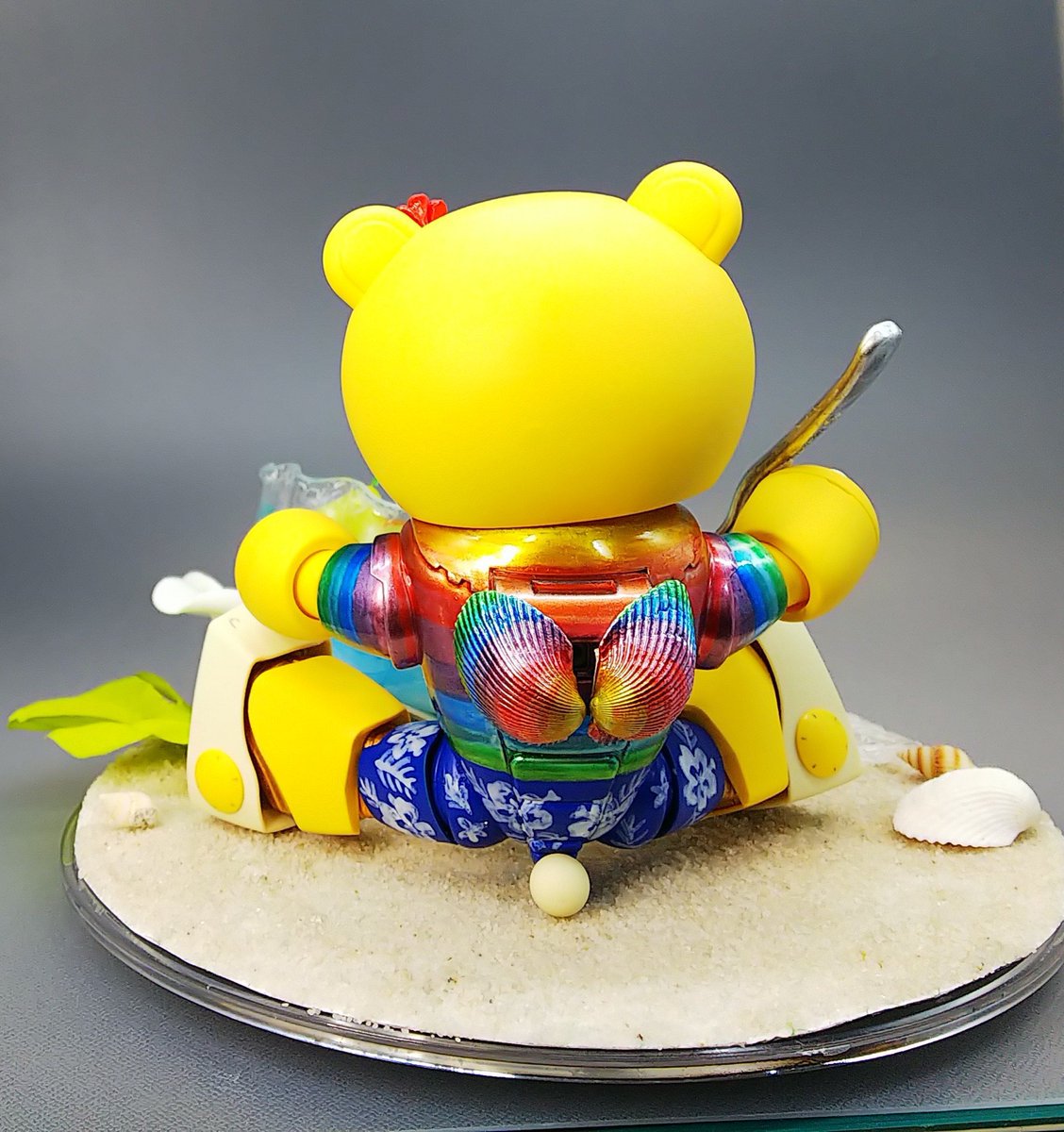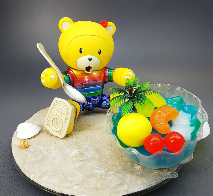 #ガンプラユニーク塗装コンペ 過去作OKなので 『ベアッガイⅢの夏。』 で参加させていただきます🌺 本体の艶消しクリア含め、オール アクリジョン 筆塗り 仕上げ🖌️ 夏っぽく濃いめのメタリックレインボーグラデーションのTシャツ&貝殻リボン🌈ハイビスカス柄パンツ👖南の島なスイーツ🍹砂浜🏖️