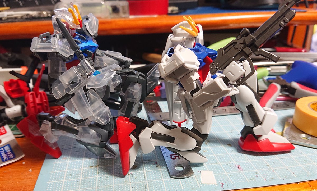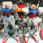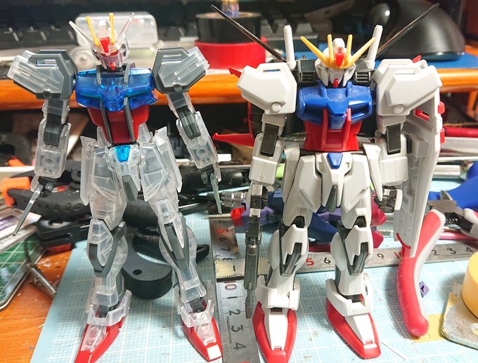 #ガンプラ #ガンプラの画像貼るとRTされると聞いて #ガンプラ一番くじ2021 EGストライク出来たから 旧HGストライクと比べてみた 膝 肘の曲がり具合が大分違うなぁ 旧型のエールでも装備できた