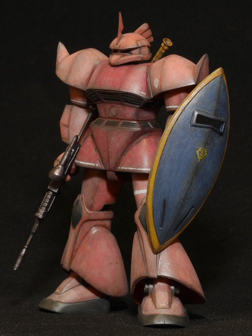 改めて撮影したのでUPします。 #旧キット #ゲルググ (1/144) 前回の1/100グフ同様、元キットを極力活かして大きな改造はモノアイのみ、塗装は成型色を活かしたウェザリング仕上げ。例によって #ガンプラ凄技テクニック 、#ガンプラお気楽制作ガイド をがっつり参考にさせて頂いてます。