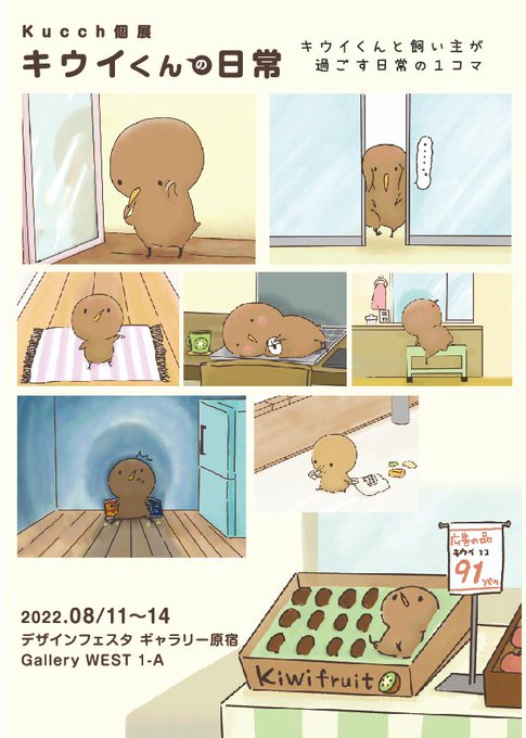 11日から個展を開催します! テーマは「キウイくんの日常」 キウイくんと飼い主が過ごす日常や、キウイくんたちがゆるく日々を過ごすイラストの展示、グッズの販売をします🥝 【期間】8/11〜14 【場所】デザインフェスタギャラリー原宿 WEST 1-A(@DFGHarajuku) #DFGHarajuku #キウイくん #イラスト