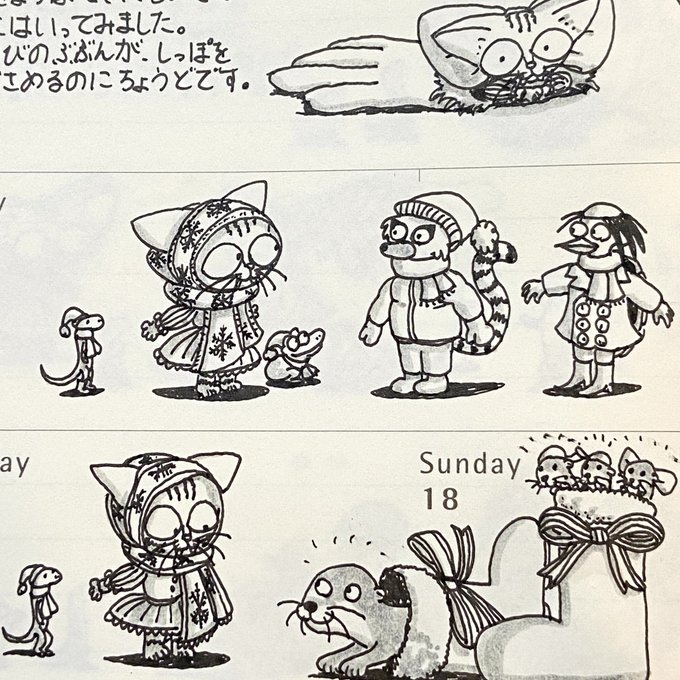 先週の「ミーシャちゃんの日記」 ミーシャちゃんと 冬着のお友達 #カワウソ #キツネザル #カッパ #クリスマス #猫 #猫イラスト #絵 #イラスト #絵描きさんと繋がりたい #イラスト好きな人と繋がりたい #モレスキン #手帳 #ミーシャちゃんの日記