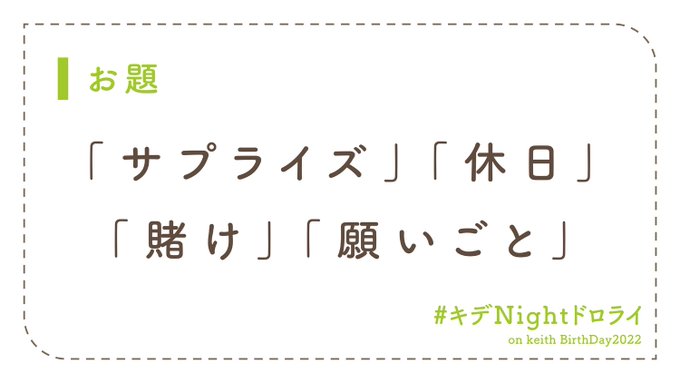 【イベント事前企画のお知らせ】 お待たせいたしました! #キデNightドロライ 初回のお題を発表いたします。 お題は… 「サプライズ」「休日」「賭け」「願いごと」 投稿日時は🍺のお誕生日【11月10日(木)0時】です🎂🎉