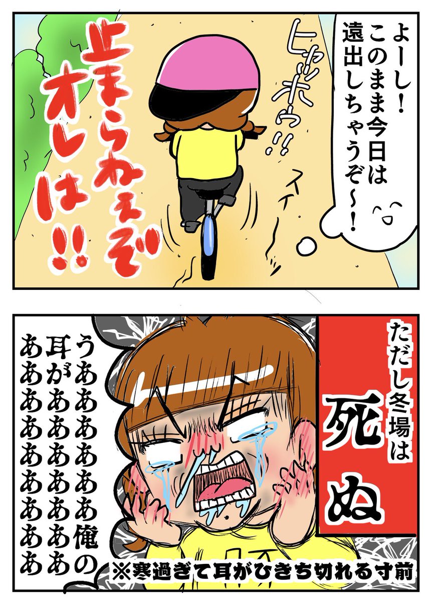 先日、耳の感覚戻すのに めちゃめちゃ時間かかった。 今度から耳まで すっぽりニット帽被るしかねえ…涙 でもチャリで遠出するの好き…😭❤️ #キミが笑えばそれでイイ #エッセイ漫画 #漫画が読めるハッシュタグ #イラスト #illustration