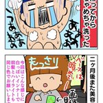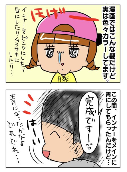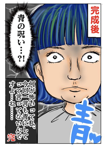 「夏のコワイ話 青の呪い…」 お久しぶりです!ナベマニです! 約三か月ぶりの漫画でごぜえます! とゆーわけで髪の毛が青いです! インナー白っぽくして言ったのに! 夏だからかな!うんこ! #キミが笑えばそれでイイ #エッセイ漫画 #漫画が読めるハッシュタグ #イラスト #illustration