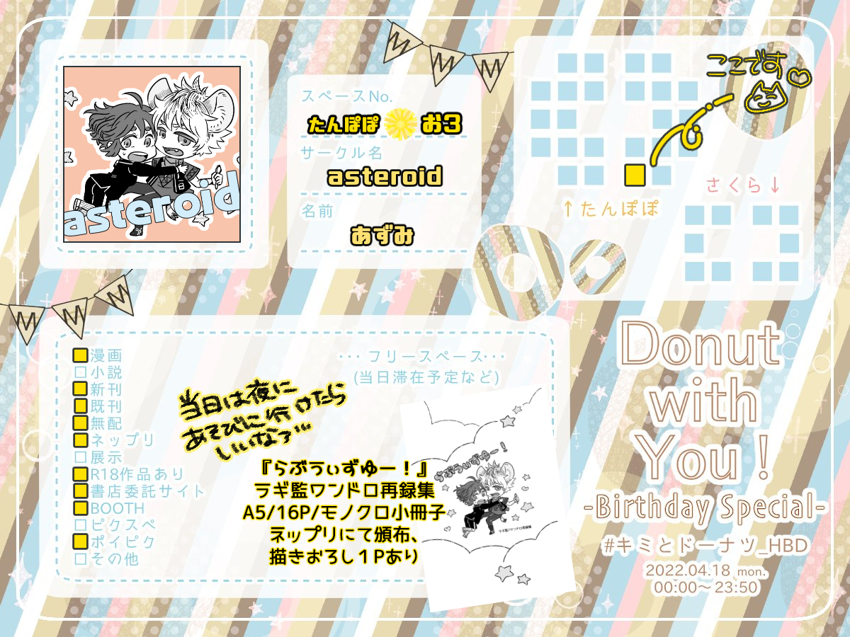 【告知】 4/18🍩BDのイベントに申込しております!サクカはこちら~。新刊はラギ監ワンドロ @Ruggikan_1draw で描いてた作品の再録ネップリ頒布を予定しております~。よろしくお願いします! #キミとドーナツ_HBD 【イベント】Donut with You!-Birthday Special- pictsquare.net/4nk0kjhlf0casp…