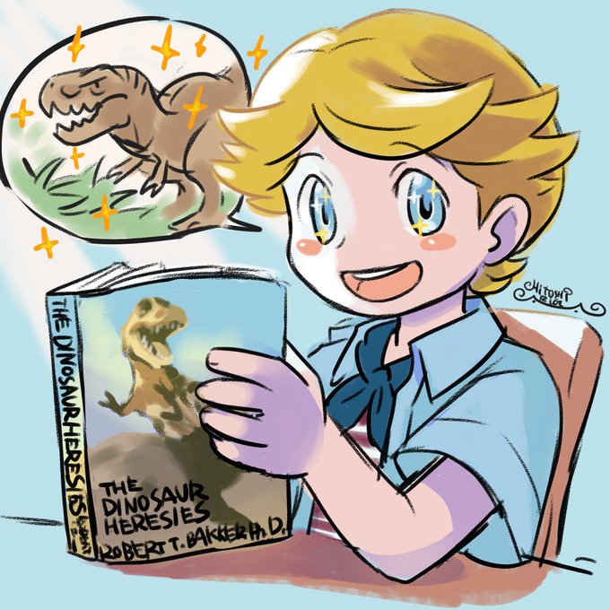 ティムが先生に勧められたバッカーの本を読んでるところ ティムが劇中で言ってたバッカー博士の本(恐竜異説)は私の大好きな本です😊 グラント博士の本、読んでみたいなあ #ジュラシックパーク #キミノベル twitter.com/p_kiminovel/st…