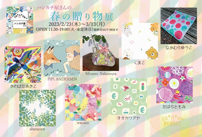 阿佐ヶ谷のca*n*owFORESTで新作原画と今まで作ったハンカチをご覧いただけます。お気に入りのハンカチをギフトや春の新生活にいかがでしょうか🌸? #キャナウのハンカチ屋さん #キャナウフォレスト #イラスト好きさんと繋がりたい #illustration twitter.com/ayainc/status/…
