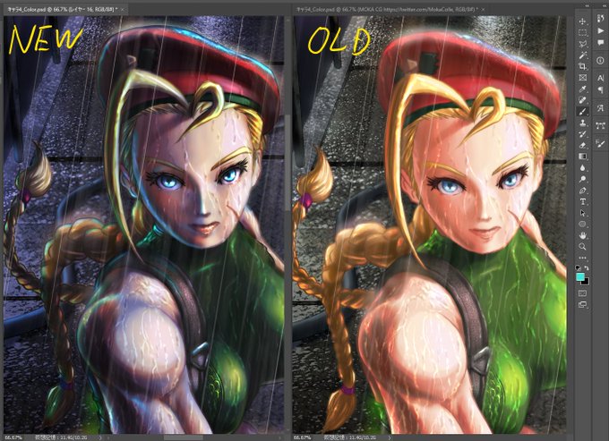 新刊収録用に過去に描いたキャミィイラストをブラッシュアップ中😌 だいぶドラマチックなライティングというか情感が出てきた気がしますね そして、、こんな感じのブラッシュアップをあと十数枚、、 ワイは出来る子!💪😤 なのでみんなワイを励ましてくれ! #キャミィ #格ゲーキャラ描こうぜ twitter.com/i/web/status/1…