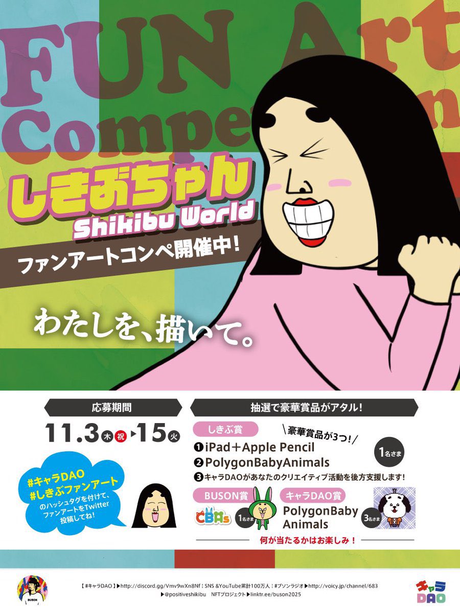 しきぶちゃんを描いて豪華賞品&NFTをゲットしよう🚀 キャラDAOでは芸術の秋🍂キャンペーンでファンアートコンペを開催🏆 応募は11月3日 (木)〜 みんなの投稿,待ってまーす🌟 #キャラDAO #しきぶファンアート @BUSON2025 @Shikibu_nft