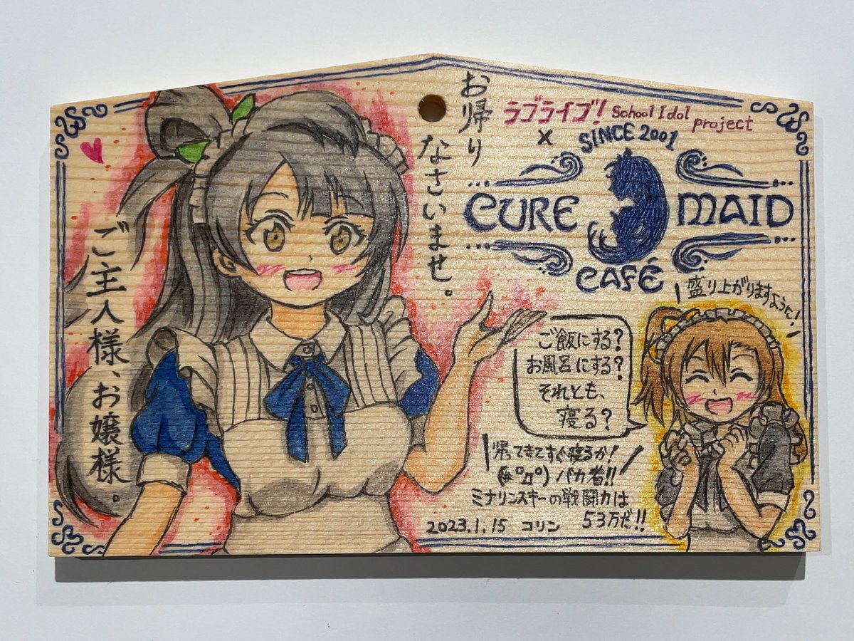 神田明神に絵馬奉納しました。ラブライブ!1期9話、秋葉原に現れた伝説のメイド.ミナリンスキー(南ことり)と高坂穂乃果を描きました。 元祖.メイドカフェ発祥の地、またμ'sとコラボして本当に嬉しかったです(・∀・) #lovelive #μsicforever #キュアメイドカフェ