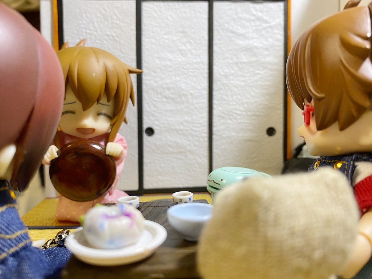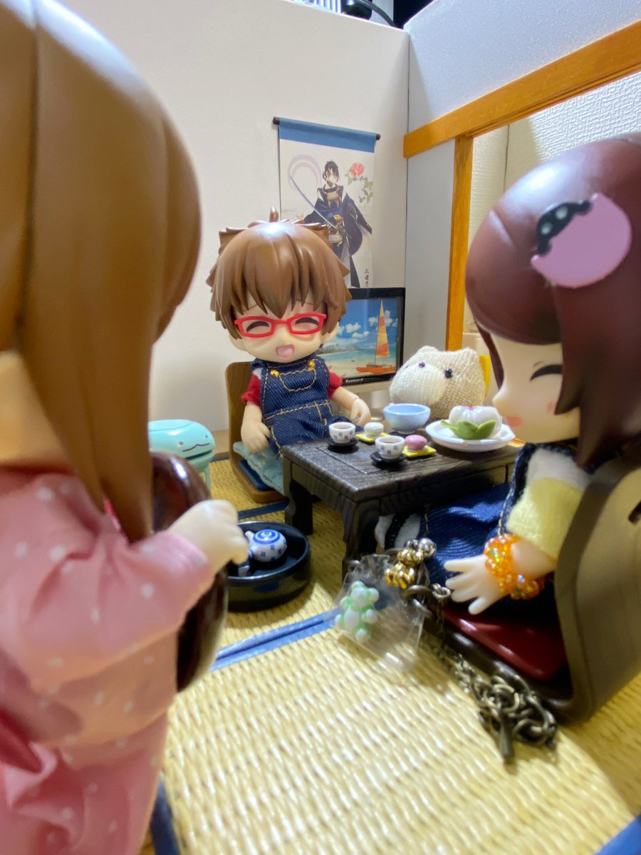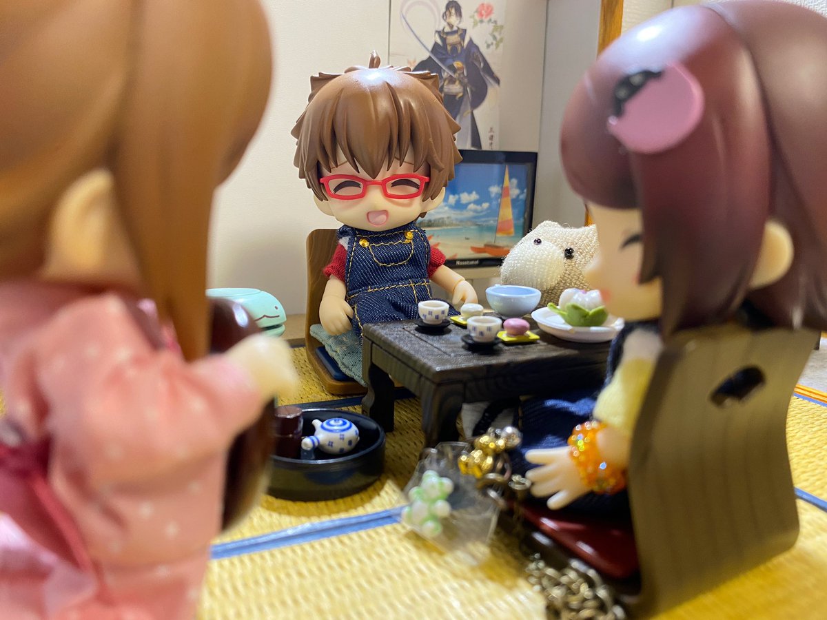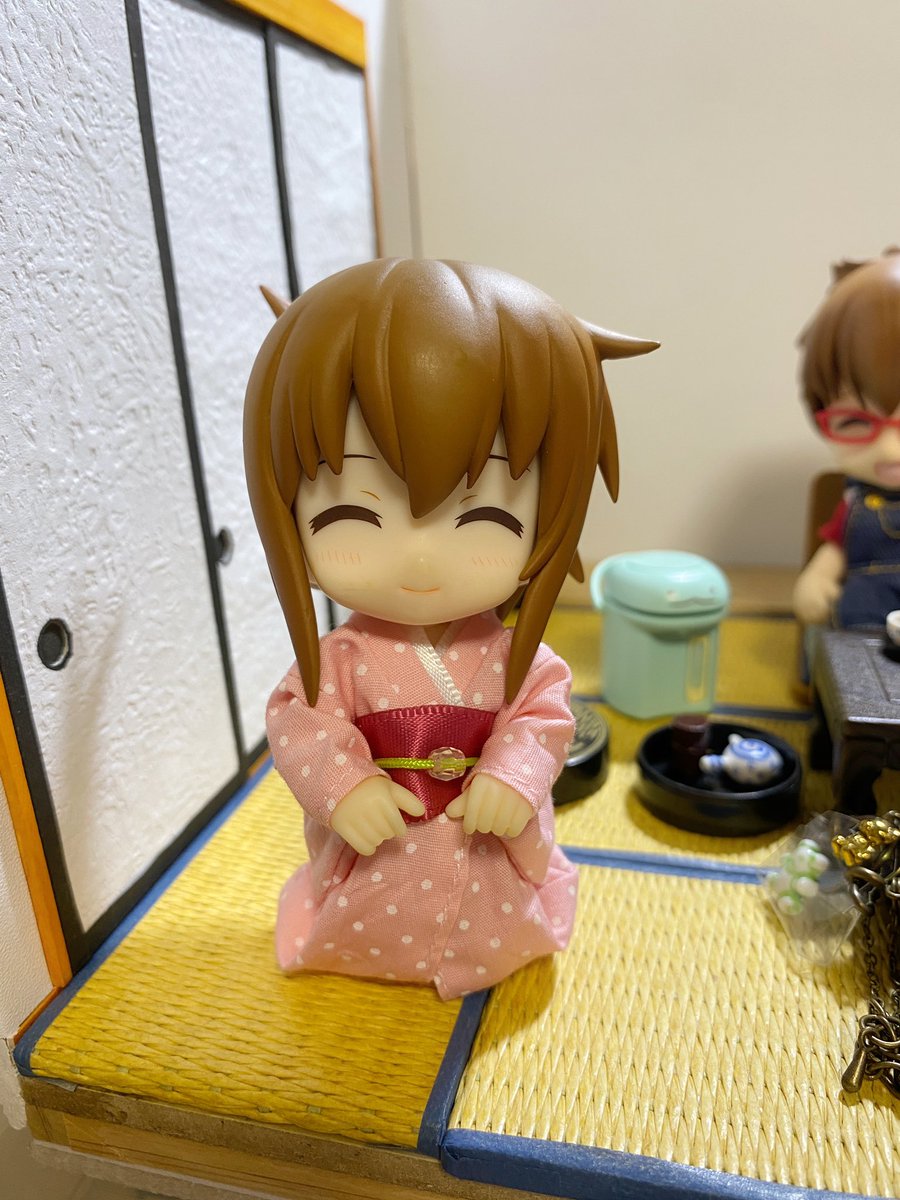 こんばんはです🌉 フリマで買った茶器セットも届きました😊 電ちゃんに仲居さんになってもらいましたけど、カワイイですね😆💕 お着物がよく似合ってます😊 #キューポッシュ #子ぐまのグリちゃん #キュポ和室