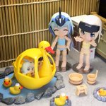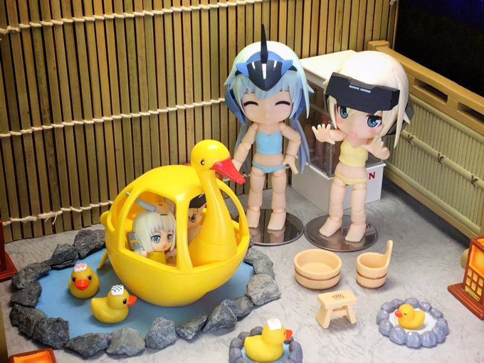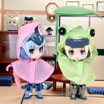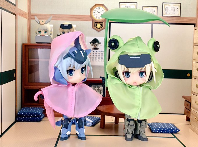 #夜のフィギュア撮影会 #キューポッシュ #フレームアームズ・ガール #FAガール 【5/20 お題 『空』】【既出】 「これから梅雨入り、この装備を持ち歩けばどんな空模様でも安心です。」 「アンタ似合うわねぇ、カエル‥。」