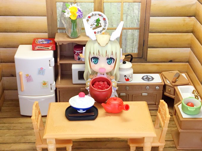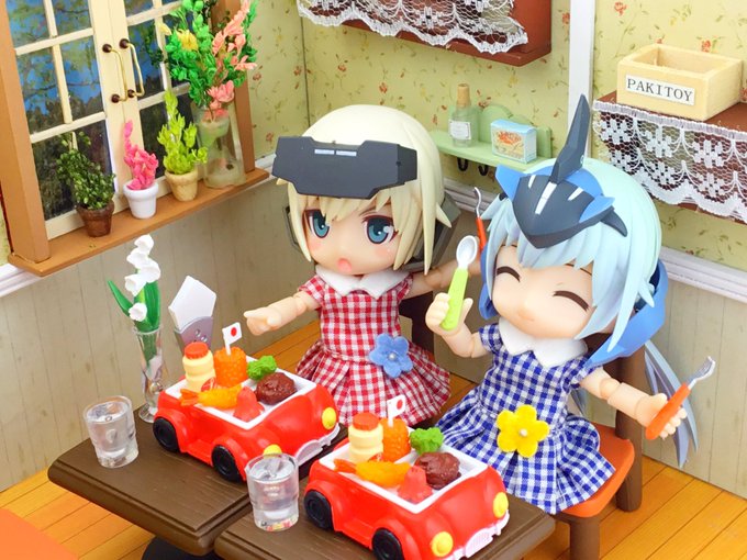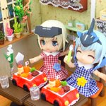 #夜のフィギュア撮影会 #キューポッシュ #フレームアームズ・ガール #FAガール 【6/12 お題 『自動』】 「おー、旗まで立ってる‼️」 「お子様ランチは子供の特権ね🎶器になってる自動車もかわいいデザインね💕」