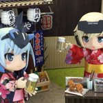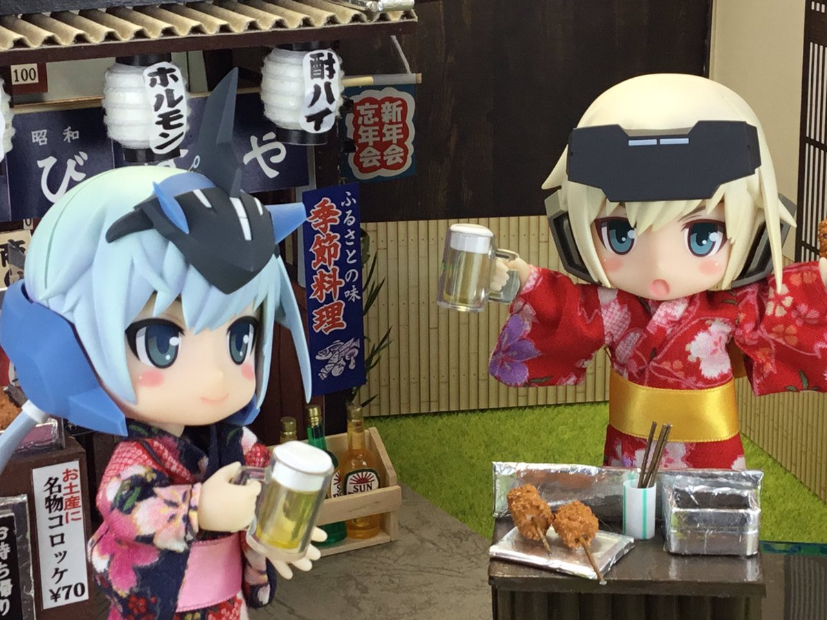 #夜のフィギュア撮影会 #キューポッシュ #フレームアームズ・ガール #FAガール 【6/21 お題 『飲む』】【既出】 「さあ、乾杯といきましょう‼️」 「この時期に外で飲むビールは最高ね🎶」