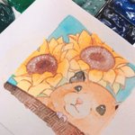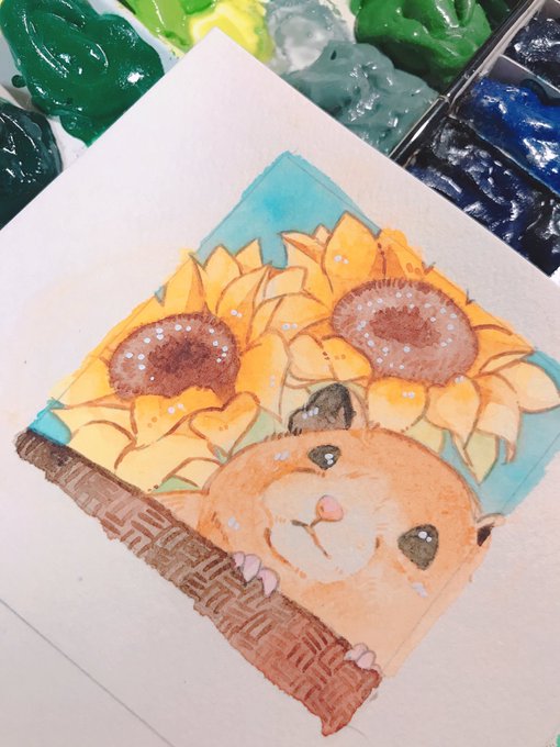 旦那さんの親友に誕プレで贈るイラスト完成しました(*ˊ꒳ˋ*) 飼ってるキンクマハムスターと夏生まれなのでひまわりを一緒に🌻🐹✨ 可愛く描けて嬉しい✌( ¨̮ ✌ #透明水彩 #キンクマハムスター