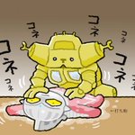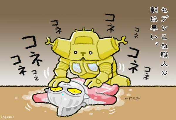 #キングジョー55周年 #ファンアート セブンこね職人の朝は早い。 「いきのいいウルトラセブンが来た時は特に念入りにコネコネペダペダしなきゃなりませんからね。コネコネペダペダが足りないとこっちがひっくり返されちまう。セブンが弱るまでコネコネペダペダするんです」
