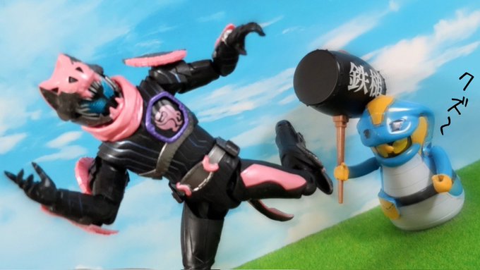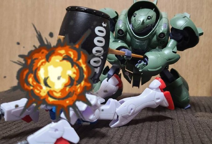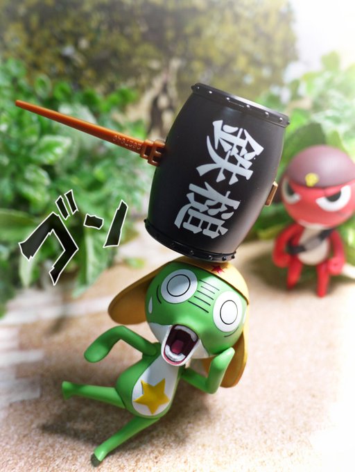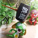 #夜のフィギュア撮影会 4/10お題 『飛』 ケロロ「うおおおおなんか飛んできたであります!!!」 ギロロ「…自業自得だな。」 #ケロロ軍曹 #海洋堂 #ガチャガチャ #カプセルトイ #ギャグ武器コレクション