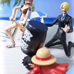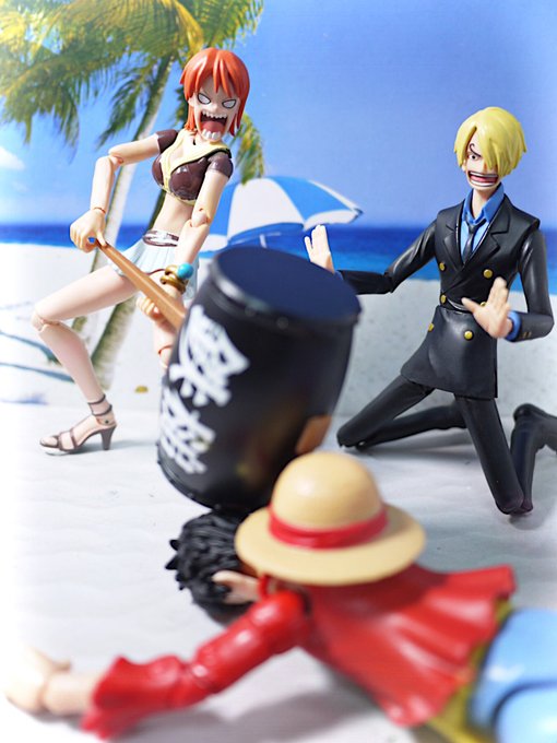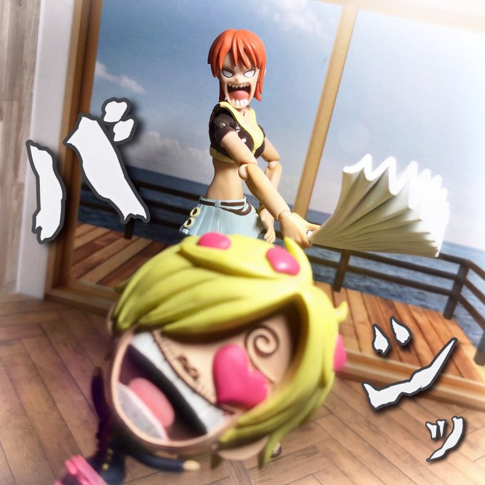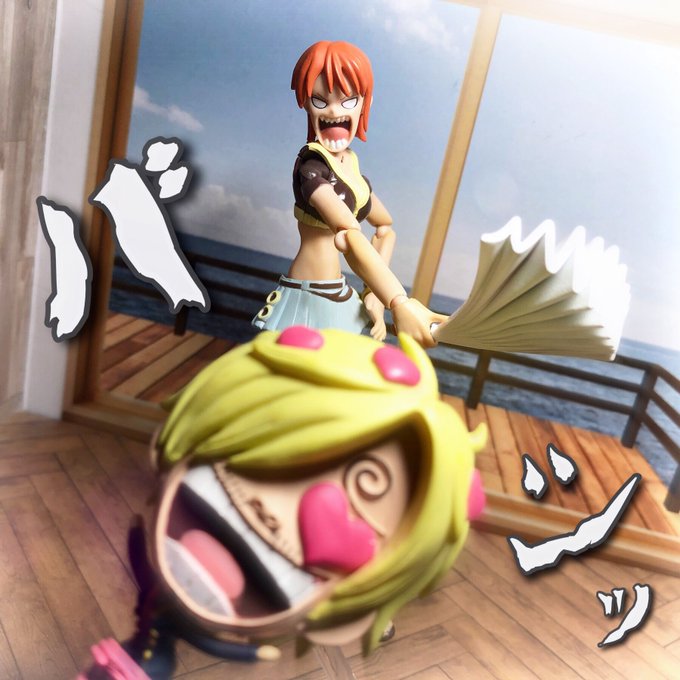 #夜のフィギュア撮影会 8/4 お題 『タイム』 サンジ「ナミさんタイム!ルフィがおやつ盗み食いしたっていうの俺の勘違いだった…っと遅かったか」 ナミ「ちょっと!あんたのせいで無実のルフィに鉄槌下しちゃったじゃない!?」 #onepiece #ガチャガチャ #カプセルトイ #ギャグ武器コレクション