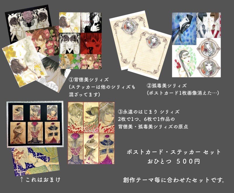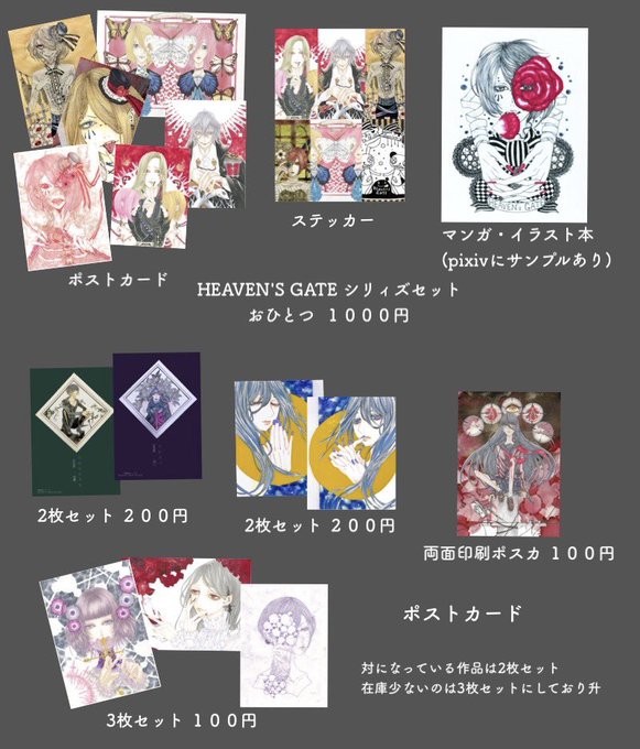 【天使と悪魔展Settlement】 会場: #ギャラリーメトロノーム @tuduku__ 27日まで開催しており升🥀 ツイキャスで紹介して頂きました🥀✨ セット品ばかりなので、中身分からなくて申し訳ない…うろ覚えのお品書きです💦 本のサンプルはこちら↓ #pixiv pixiv.net/artworks/61967… #東広島市 twitter.com/tuduku__/statu…