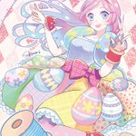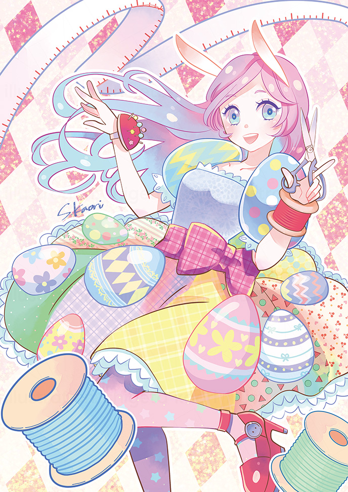 【展示会作品紹介①】 「ピンクイースターラビット〜spring〜」 パステルカラーのイースターエッグをあしらったお洋服を描きました! GalleryIYN様 『かわいい仕立て屋』春夏コレクション 会期:3/31〜4/10 #iyn #ギャラリーIYN #絵描きさんと繋がりたい #イラスト好きさんと繋がりたい #創作