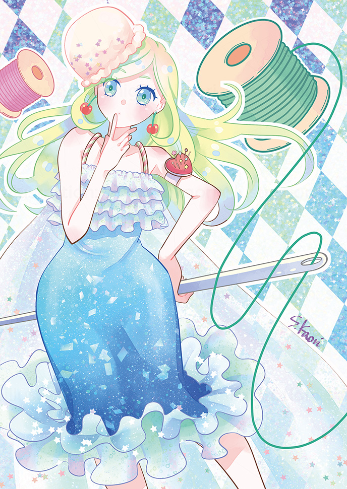 【展示会作品紹介②】 「ブルークリームソーダ〜summer〜」 キラキラしゅわしゅわのドレスはボディラインをグラスの曲線に見立てました🍹 GalleryIYN様 『かわいい仕立て屋』春夏コレクション 会期:3/31〜4/10 #iyn #ギャラリーIYN #絵描きさんと繋がりたい #イラスト好きさんと繋がりたい #創作