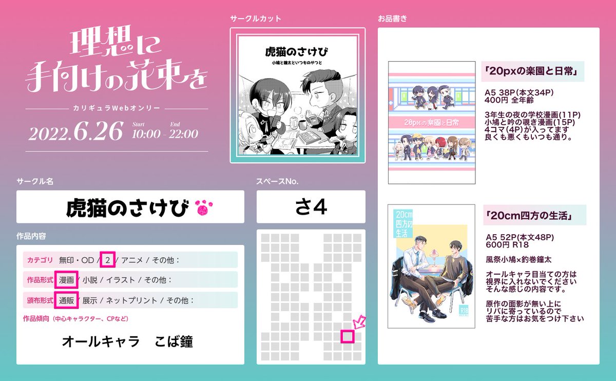 サークルカットを新たに描いたので改めて告知いたします 「さ4」でスペース頂きました。BOOTHでの通販で匿名配送になります、よろしくお願いします。 サクカの部長とキィがこの配置だと完全に下半身が座席に埋まっておりますが、本の内容も概ねそんな感じです。 #ギュラwebオンリー