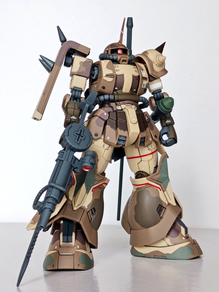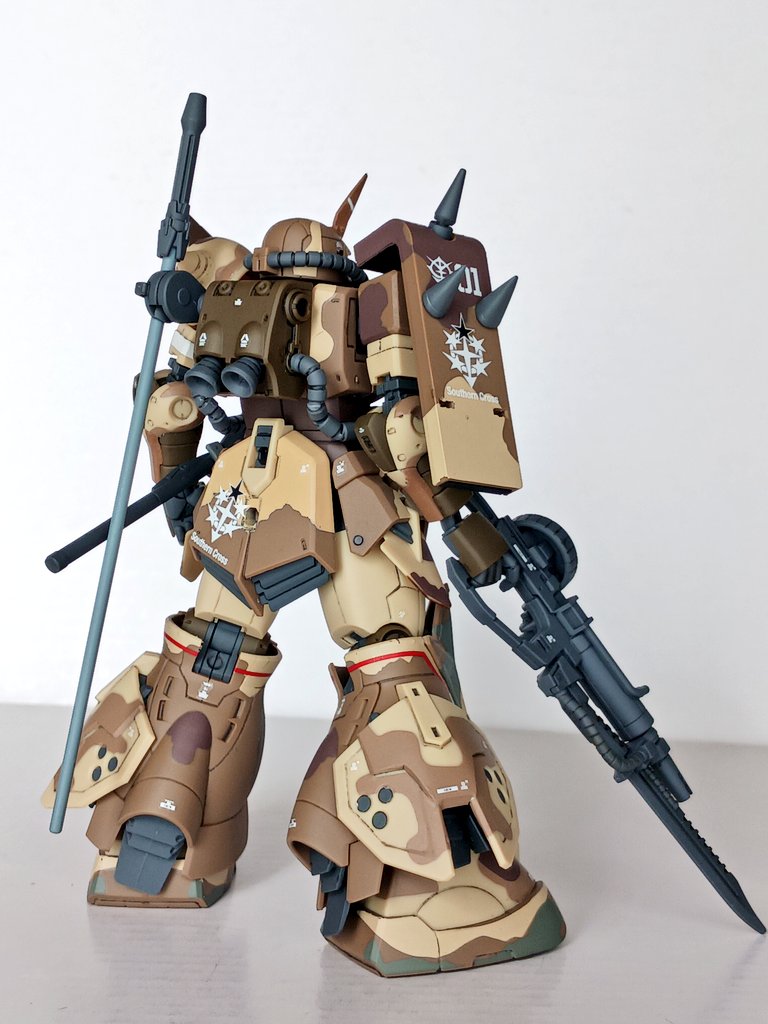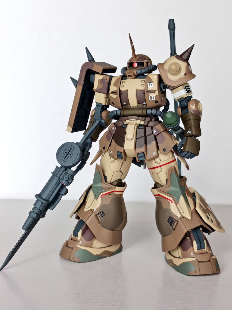 高機動型ザク地上用(エグバ機)完成しました。ブレードアンテナは自作、シールドにスパイク追加、左肩のスパイクをビルダーズパーツMSスパイク01に差し替え、シュツルムファウスト追加。 #ガンプラ #ガンプラの画像貼るとRTされると聞いて #ククルスドアンの島