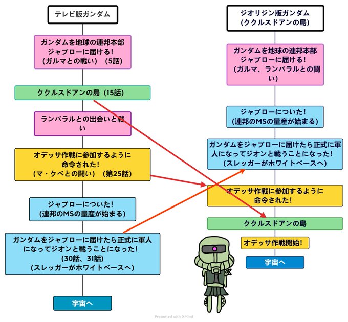 映画、ククルスドアンの島予習として 今回の映画は漫画のジオリジンの時系列で作られていて一部アニメ版と違います 1番の違いはオデッサ作戦とジャブロー編が逆になっているのでジムがたくさん出ます ドアンの話もガルマとランバラルの間からオデッサ作戦の間になっています #ククルス・ドアンの島