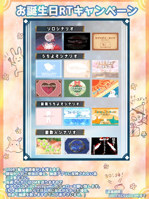🎂誕生日RTキャンペーン🎂 誕生日なのでちょいと浮かれた企画です💠🥳 🎁参加方法 本ツイートをRT (気になるシナリオのツイートをRTやいいねしてくれると嬉しいです✨👏) 🎉対象シナリオ 画像記載のシナリオ 🎁当選人数 2名(100RT毎に1名追加) 🎉期間 2023.1/2(23:59)迄 #クトゥルフ神話TRPG