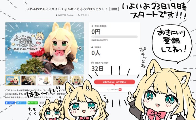 ふわふわちゃんぬいぐるみ化計画いよいよ明日19時スタートです!!! お気に入り登録して応援よろしくおねがいします!! ふわふわケモミミメイドチャンぬいぐるみプロジェクト! camp-fire.jp/projects/view/… #クラウドファンディングCAMPFIRE @campfirejpより
