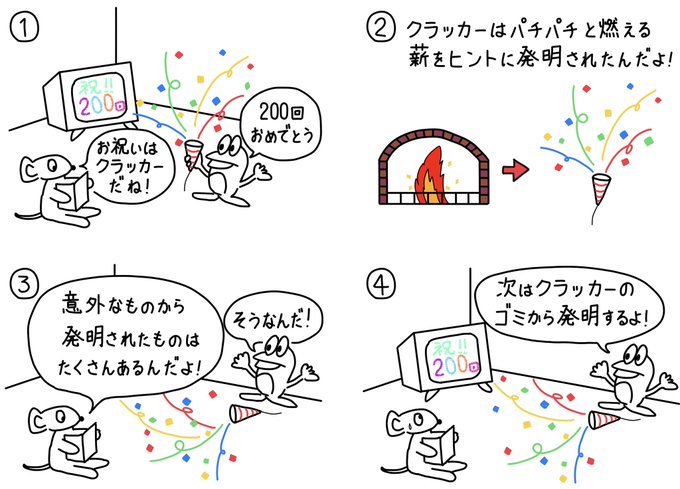201シュールな発明 前回の続きです。 #漫画が読めるハッシュタグ #絵描きさんと繫がりたい #みんなで楽しむTwitter展覧会 #発明 #4コマ漫画 #クラッカー #漫画 #manga