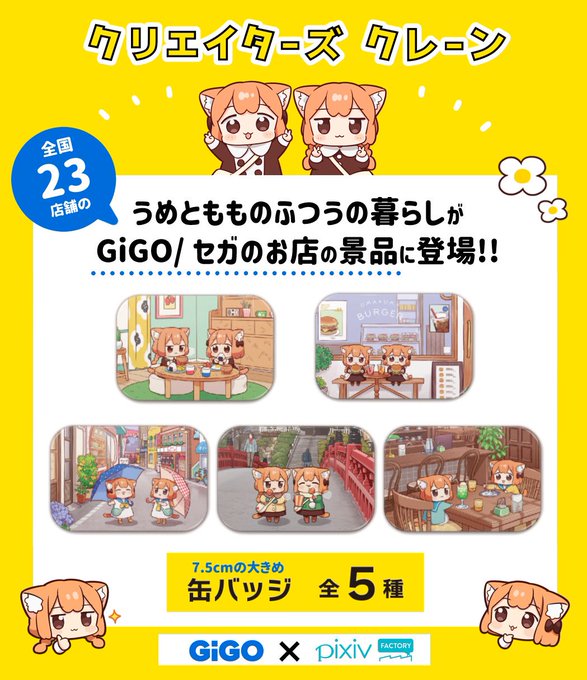📣本日スタート うめとももの缶バッジがクレーンゲームの景品になりました! 全国23店舗のGiGO/セガのお店の #クリエイターズクレーン に登場します。オンラインでも遊べます!↓ #うめともものふつうの暮らし twitter.com/creators_crane…