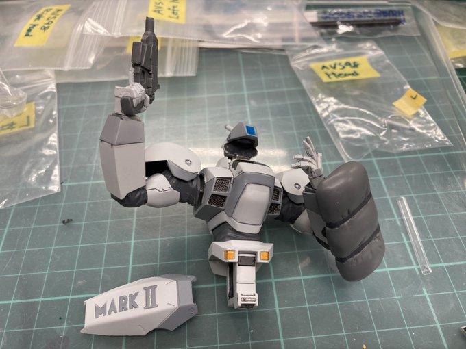 塗装1回目 カラリングのイメージはガンダムのロールアウトカラー 一旦組んで色味チェック 濃度のバラつき発見 次回フォローせねば 次回に向けてバラしてマスキング。 #クリエイターズワン #パトレイバー模型部 #篠原重工八王子工場