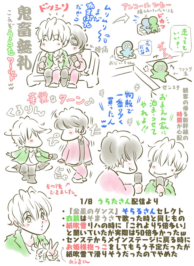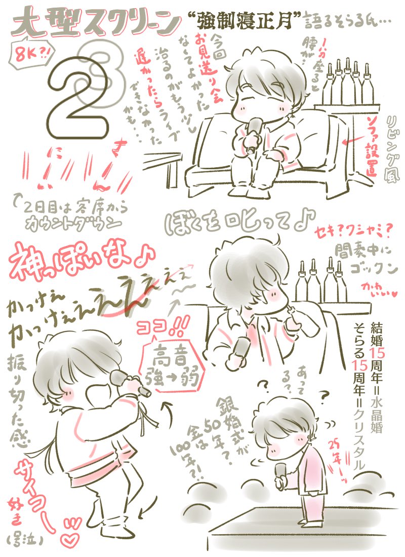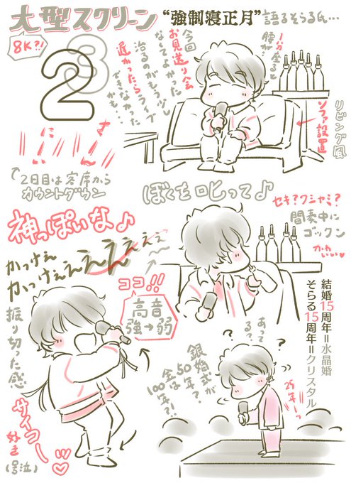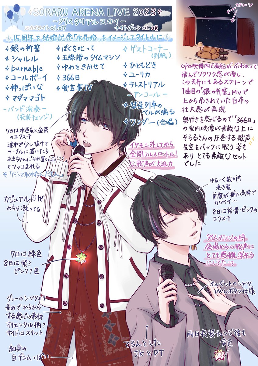 そらるさん 2023アリーナライブ 『クリスタリアルスカイ』 ライブレポ 1/7-1/8 自分の備忘録なので会話はニュアンス的なところあり、個人の主観あります ゲスト部分はトークが主 たくさん笑ったし紙吹雪すごくて感動したし、そらるさんの笑顔最高でした #そらるの絵 #クリスタリアルスカイ