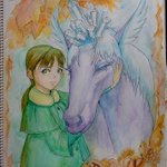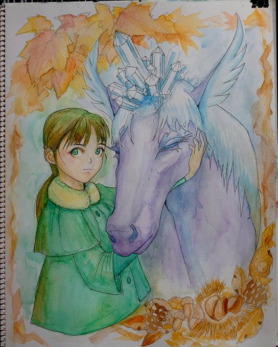 《クリスタルホース》 秋の額縁に、春を思わせる女の子と、冬を思わせる馬を描いてみました。 #イラスト #オリジナル #アナログ #透明水彩 #クリスタル #秋 #女の子 #馬 #絵師さんと繋がりたい #イラスト好きさんと繋がりたい #みんなで楽しむTwitter展覧会