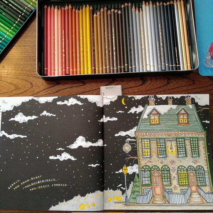 背景が最初からベタ塗りされていて新鮮な図案本📕クリスマスキャロルを題材に守銭奴が改心するまでの物語を塗り絵でw✎最近は様々な塗り絵師さんの作品見るにつけ、色んな図案本が欲しい👛その時々、気分ってあるから😆ワンダーズってのもカワイイなぁ✨ #大人の塗り絵 #クリスマスキャロル #色鉛筆